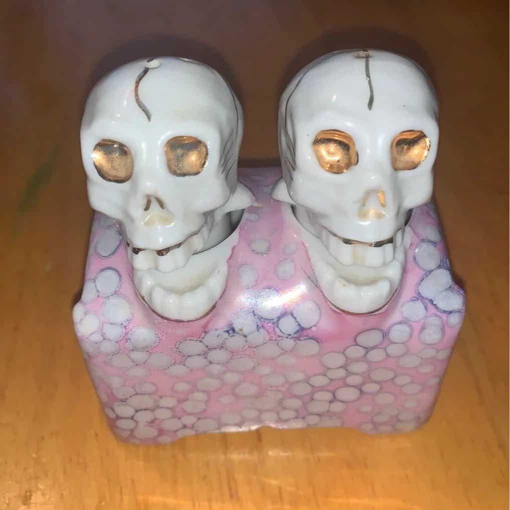 The coolest salt and pepper shaker set I had were too cool to use (i felt - which was defeating the purpose of course). A Xmas gift from mom and dad, ‘the nodders’ were probably from the 1940’s. The base a china box glazed pale magenta with blotches - kind of a treasure chest with no lid. There were two holes in the top and into each the shakers sat, atop the bottom jaws. Topped with skulls glazed white with gold accents, when filled with the right amount of salt and pepper, the weight at the bottom caused them to bob up and down laughing merrily in tandem or not.
